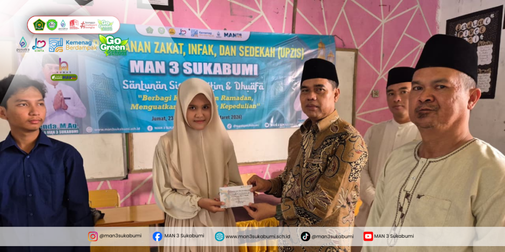 Mantis.news_Usai pelaksanaan penutupan kegiatan Pesantren Ramadan 1447 H, Unit Pengumpul Zakat, Infak, dan Sedekah (UPZIS) MAN 3 Sukabumi menyalurkan santunan kepada para siswa yang membutuhkan. Kegiatan yang dilaksanakan pada Jumat, 13 Maret 2026 di Aula MAN 3 Sukabumi ini memberikan bantuan berupa uang saku kepada 100 siswa yang termasuk kategori yatim, yatim-piatu, dan dhuafa.