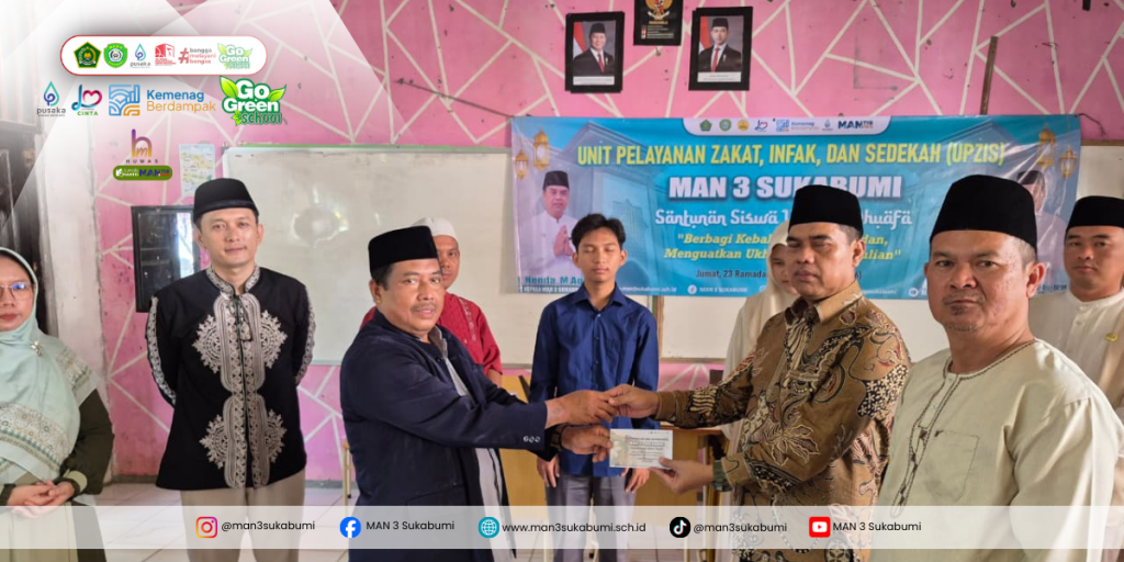Dalam rangkaian acara tersebut juga dilakukan penyerahan santunan secara simbolis. Ketua UPZIS MAN 3 Sukabumi menyerahkan amplop santunan kepada Plt. Kepala Madrasah sebagai simbol penyaluran bantuan, yang kemudian dilanjutkan dengan penyerahan santunan kepada perwakilan siswa penerima.